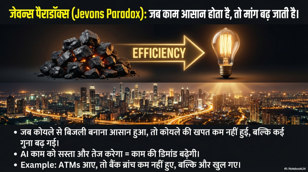1865 में इकोनॉमिस्ट विलियम जेवॉन्स ने देखा कि जब कोयले का इस्तेमाल ज्यादा एफिशिएंट हुआ (कम कोयले में ज्यादा एनर्जी), तो लोगों ने कोयले का इस्तेमाल घटाने के बजाय और बढ़ा दिया क्योंकि अब वो सस्ता और बेहतर हो गया था। यही AI के साथ हो रहा है—जब AI किसी काम को सस्ता और तेज बना देता है, तो पूरी दुनिया में उस काम की डिमांड और बढ़ जाती है!