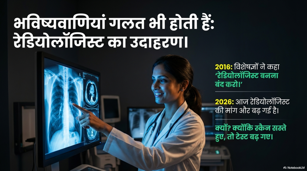 अब जरा दिल को तसल्ली देने वाली बात सुनिए। 2016 में नोबेल प्राइज विनर जेफ्री हिंटन (Geoffrey Hinton) ने भविष्यवाणी की थी कि 2026 तक रेडियोलॉजिस्ट की जरूरत खत्म हो जाएगी। आज क्या हुआ? रेडियोलॉजिस्ट की डिमांड पहले से कहीं ज्यादा है! AI ने स्कैन पढ़ना सस्ता कर दिया, जिससे अब करोड़ों लोग स्कैन करवा रहे हैं। अब रेडियोलॉजिस्ट को और भी हायर लेवल पर काम करने की जरूरत पड़ रही है।