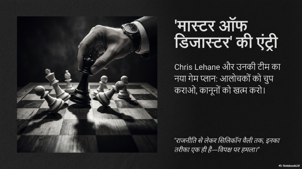 जब इन अरबपतियों की साख पर आंच आती है और उन्हें अपने ‘गंदे राज’ छुपाने होते हैं, तो वे किसी साधारण वकील को नहीं, बल्कि एक ‘फिक्सर’ को बुलाते हैं। OpenAI ने इसके लिए क्रिस लेहेन (Chris Lehane) को चुना है, जिन्हें वाशिंगटन की राजनीति में ‘Master of Disaster’ (संकटों का खिलाड़ी) कहा जाता है।