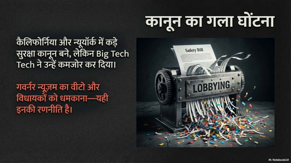 अंत में, कैलिफोर्निया के गवर्नर गेविन न्यूसम ने एक बहुत ही सख्त सुरक्षा बिल को ‘वीटो’ (रद्द) कर दिया। जानते हैं क्यों? क्योंकि टेक लॉबी ने उनके लिए एक “एग्जिट रूट” तैयार किया था। गवर्नर ने एक बहुत ही कमजोर और बेकार कानून पर साइन कर दिए ताकि वे दुनिया को दिखा सकें कि उन्होंने ‘सुरक्षा’ के लिए कुछ किया है, जबकि असल में टेक कंपनियों का बाल भी बांका नहीं हुआ। इसे कहते हैं ‘वॉल ऑफ कैश’ (पैसों की दीवार) की ताकत।