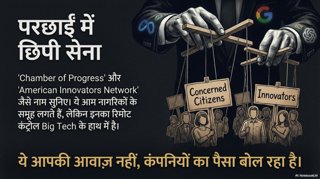 ये टेक कंपनियां कभी भी सीधे मोर्चे पर नहीं आतीं। इन्होंने कई ऐसे “शैडो ग्रुप्स” (गुप्त संगठन) बना रखे हैं जो इनके लिए ‘गंदा काम’ करते हैं। इसे तकनीकी भाषा में ‘एस्ट्रोटर्फिंग’ कहते हैं—यानी पैसा खर्च करके ऐसा “नकली जनसमर्थन” खड़ा करना जिससे लगे कि आम जनता ही इन कंपनियों के साथ है।