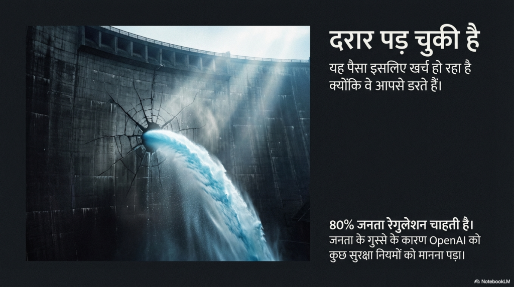 ताज़ा आंकड़ों के मुताबिक, 80% लोग चाहते हैं कि AI पर सख्त नियम होने चाहिए। लोग डरे हुए हैं क्योंकि यह उनके बच्चों की सुरक्षा, उनकी नौकरी और उनके घर के खर्चों का मामला है। अगर आपकी राय मायने नहीं रखती, तो ये टेक दिग्गज उसे दबाने के लिए करोड़ों रुपये पानी की तरह नहीं बहाते।