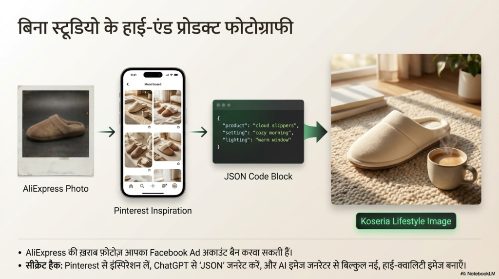 यह सबसे कमाल का हिस्सा है! इसे ध्यान से समझना क्योंकि यही आपकी सबसे ज्यादा लागत बचाएगा। Davie ने बिना असली चप्पल हाथ में लिए, वर्ल्ड-क्लास फोटोशूट कैसे किया? यहाँ उन्होंने इस्तेमाल किया ‘Visual Consistency’ का कांसेप्ट।