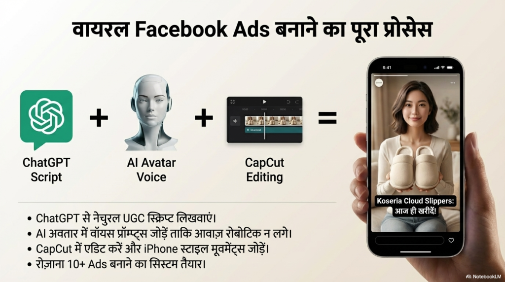 स्टोर तैयार हो गया, अब बारी है ग्राहकों को दुकान तक लाने की। इसके लिए Facebook Ads सबसे बेहतरीन है। Davie ने AI द्वारा बनाई गई फोटोज को ‘Arcads’ और ‘CapCut’ की मदद से वीडियो में बदला। उन्होंने एक UGC (User Generated Content) स्क्रिप्ट लिखी जो सुनने में बहुत नेचुरल थी—”ये चप्पलें नहीं, बादलों पर चलने जैसा अहसास हैं!”