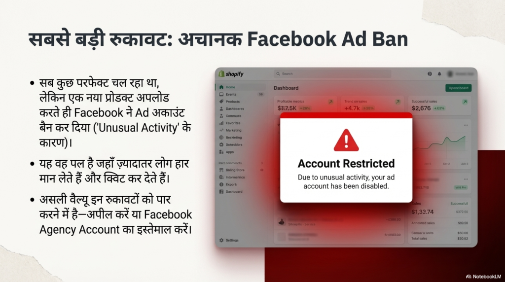 लेकिन, यहाँ एक ट्विस्ट आया। अक्सर लोग सोचते हैं कि AI से सब कुछ आसान होगा, लेकिन चुनौतियां तो आएंगी ही। Davie का एड अकाउंट अचानक “Ban” हो गया। इसे मैं कहता हूँ “Zuckerberg se kushti” (जुकरबर्ग से कुश्ती)!