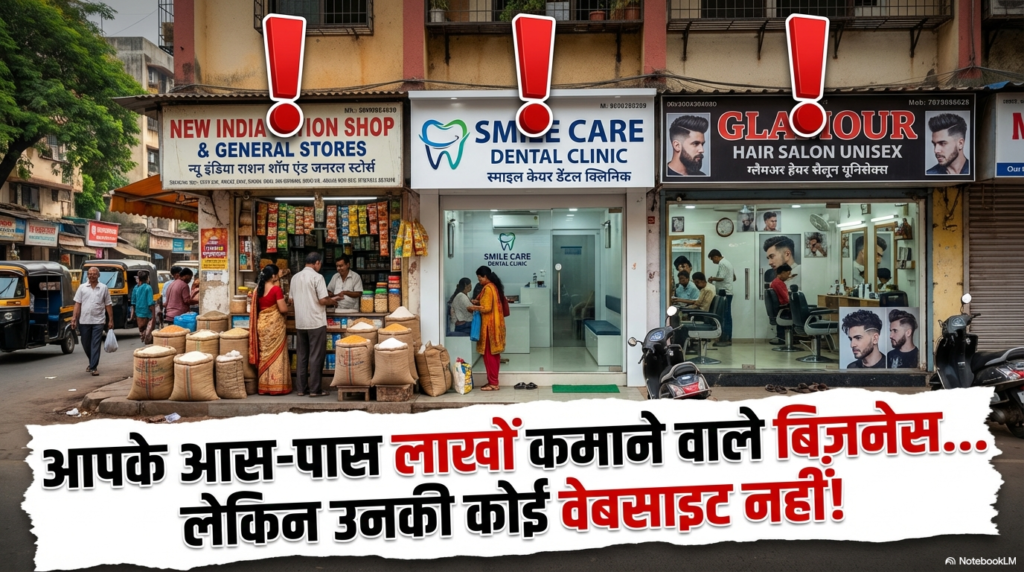 यहीं पर छिपा है असली पैसा! आप अपने घर के पास के किसी भी “चौक” या मार्केट में चले जाइए। आपको वहाँ लाइनों से दुकानें दिखेंगी— शर्मा जी का डेंटल क्लिनिक, वर्मा जी का पेट स्टोर, कोई रियल एस्टेट ब्रोकर का ऑफिस, या कोई बड़ा ब्यूटी पार्लर। ये लोग साल का लाखों-करोड़ों का टर्नओवर कर रहे हैं, लेकिन मजे की बात देखिए— इनमें से 90% बिज़नेसेस की अपनी कोई वेबसाइट ही नहीं है।