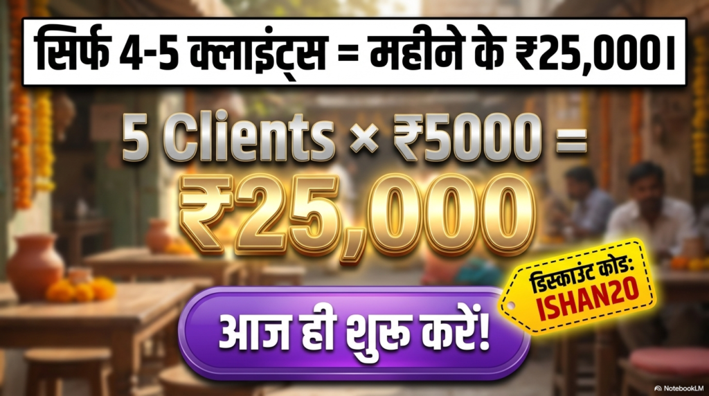 • पहले 5 क्लाइंट्स (Setup): 5 क्लाइंट्स x ₹5,000 = ₹25,000 (यह आपकी पहली बड़ी कमाई होगी!)