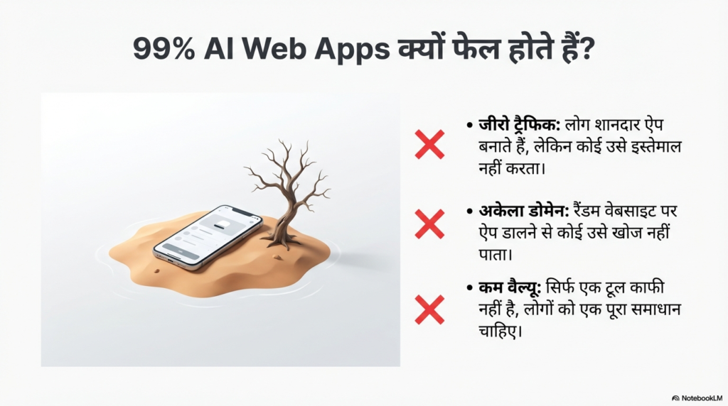 मार्केट में हर दूसरा इंसान आज AI ऐप बनाने की बात कर रहा है। लेकिन कड़वा सच यह है कि 99% AI ऐप्स फ्लॉप हो जाते हैं। क्यों? इसका कारण बहुत सिंपल है—लोग एक शानदार दिखने वाला ऐप तो बना लेते हैं, लेकिन उसे एक अनजान वेबसाइट या डोमेन पर डाल देते हैं। यह बिल्कुल वैसा ही है जैसे आपने घने जंगल के बीच एक आलीशान शोरूम खोल लिया हो, जहां कोई रास्ता ही नहीं जाता। नतीजा? न कोई ग्राहक आता है, न कोई उसे इस्तेमाल करता है।