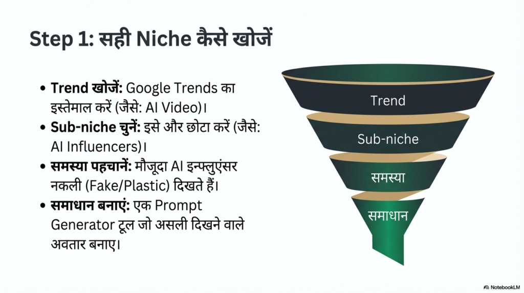 - Broad से Specific (Niche) बनें: मान लीजिए आपने देखा कि “AI Video” बहुत ट्रेंड में है। लेकिन यह बहुत बड़ा समंदर है। इसमें उतरेंगे तो डूब जाएंगे। लियम ने गहराई में जाकर एक उप-निश (Sub-niche) चुनी—“AI Influencers”।