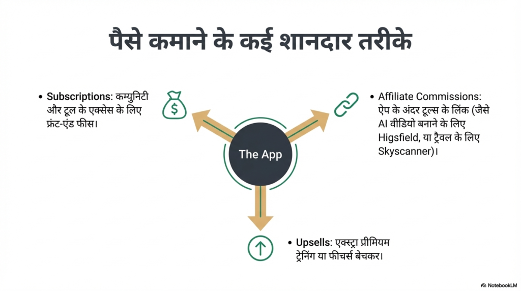 - Front-end Subscriptions: सबसे पहले, लोग आपकी कम्युनिटी और प्रीमियम टूल्स का इस्तेमाल करने के लिए एक मंथली फीस (जैसे ₹999 या ₹1999) देते हैं। यह आपकी फिक्स्ड इनकम बन जाती है।
