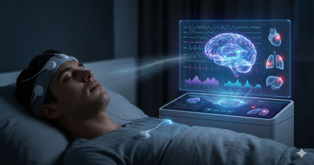 यह AI उस डेटा का इस्तेमाल करता है जो एक ख़ास मेडिकल प्रक्रिया ‘पॉलीसोम्नोग्राफी’ (Polysomnography या PSG) से मिलता है। सरल शब्दों में, PSG एक बहुत ही विस्तृत ‘स्लीप स्टडी’ है। इसमें जब कोई व्यक्ति सो रहा होता है, तो डॉक्टर उसके शरीर से निकलने वाले कई तरह के संकेतों (Signals) को मशीनों के ज़रिए मॉनिटर और रिकॉर्ड करते हैं।