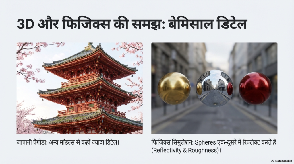 सिर्फ इतना ही नहीं, 3D एनीमेशन में भी ये “Pro” है। पुराने मॉडल्स अक्सर 3D को “clunky toys” जैसा बना देते थे, लेकिन Gemini ने जब एक “Pagoda” (मंदिर) की डिज़ाइन बनाई, तो उसमें छत की एक-एक टाइल (Roof tiles) और चेरी ब्लॉसम के फूलों की बारीकी साफ दिख रही थी। इसकी “Spatial Understanding” यानी गहराई की समझ वाकई बेमिसाल है।