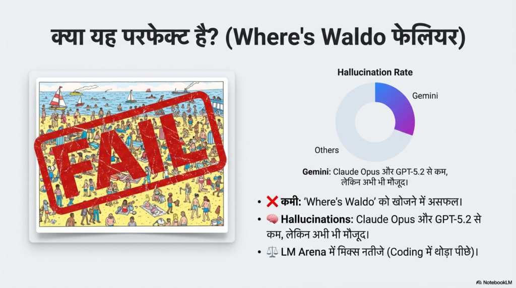 लेकिन क्या ये परफेक्ट है? नहीं। “Where’s Waldo” (भीड़ में एक फोटो ढूंढना) वाले टेस्ट में ये फेल हो गया और गलत जवाब दिया। इसे कहते हैं “Hallucination” (भ्रम)। इसलिए, चाहे ये कितना भी स्मार्ट क्यों न हो, इसके जवाबों को एक बार अपनी आँखों से चेक करना हमेशा समझदारी है।
