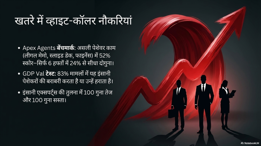 हैरानी की बात यह है कि जनवरी 2026 में इस टेस्ट का सबसे अच्छा स्कोर सिर्फ 24% था। महज 6 से 8 हफ्तों के भीतर यह 24% से उछलकर 52% पर पहुँच गया है। यह रफ्तार डराने वाली है। भारत जैसे देश में, जहाँ गुड़गांव और बेंगलुरु के ऑफिसों में लाखों ‘जूनियर एनालिस्ट’ और ‘पैरालीगल’ (Paralegals) काम करते हैं, उनके लिए यह एक बड़ी चेतावनी है। जो काम एक जूनियर कर्मचारी 5-10 दिनों में करता है, यह मॉडल उसे कुछ ही पलों में ‘सिंगल शॉट’ (बिना दोबारा पूछे) में पूरा कर रहा है।