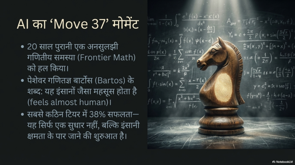 इसे टेक जगत में “Move 37” पल कहा जा रहा है। जिन लोगों को नहीं पता, उन्हें बता दूँ कि 2016 में AlphaGo नाम के AI ने महान खिलाड़ी ली सेडोल को ‘Go’ (शतरंज जैसा एक जटिल खेल) में हराते समय एक ऐसी चाल चली थी—जिसे ‘Move 37’ कहा जाता है—जिसकी कल्पना किसी इंसान ने नहीं की थी। GPT-5.4 Pro द्वारा 20 साल पुरानी गणित की पहेली सुलझाना भी वैसा ही “सुपरह्यूमन” (इंसानों से परे) कारनामा है। यह साबित करता है कि AI अब केवल डेटा को दोहरा नहीं रहा, बल्कि वह ‘रिसर्च लेवल’ पर सोच सकता है।