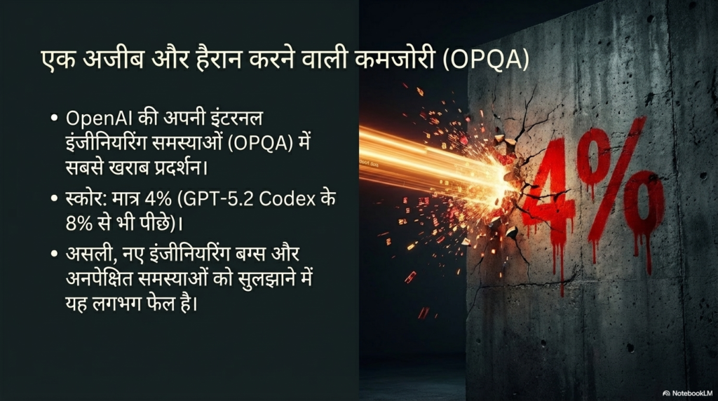 एक सच्चा पत्रकार होने के नाते मुझे आपको सिक्के का दूसरा पहलू भी दिखाना होगा। GPT-5.4 Pro हर जगह महान नहीं है। एक टेस्ट है जिसका नाम है OPQA। यह टेस्ट उन समस्याओं पर आधारित होता है जिन्हें सुलझाने में खुद OpenAI की टीम को पूरा दिन लग गया—यानी असल दुनिया की नई और जटिल इंजीनियरिंग समस्याएं।