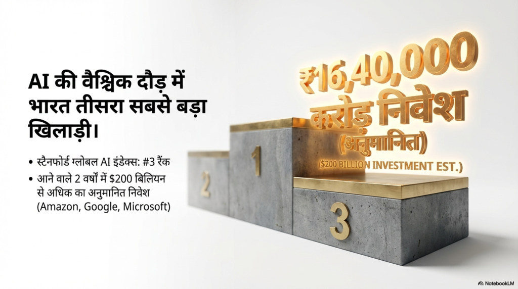 क्या यह सिर्फ एक इत्तेफाक है? बिल्कुल नहीं! आज हमारा प्यारा भारत सिर्फ सॉफ्टवेयर एक्सपोर्ट करने वाली ‘बैक-ऑफिस’ मशीन नहीं रहा, बल्कि यह दुनिया की सबसे बड़ी AI लेबोरेटरी बन चुका है। दोस्तों, आंकड़े ऐसे हैं कि सुनकर आपके होश उड़ जाएंगे। Amazon, Google और Microsoft जैसी दिग्गज कंपनियाँ भारत में अपने AI साम्राज्य को फैलाने के लिए $67.5 बिलियन (यानी करीब 5.6 लाख करोड़ रुपये) से ज्यादा के निवेश की पोटली लेकर तैयार बैठी हैं। और यकीन मानिए, यह तो बस एक शुरुआत है, असली तहलका तो अभी बाकी है!