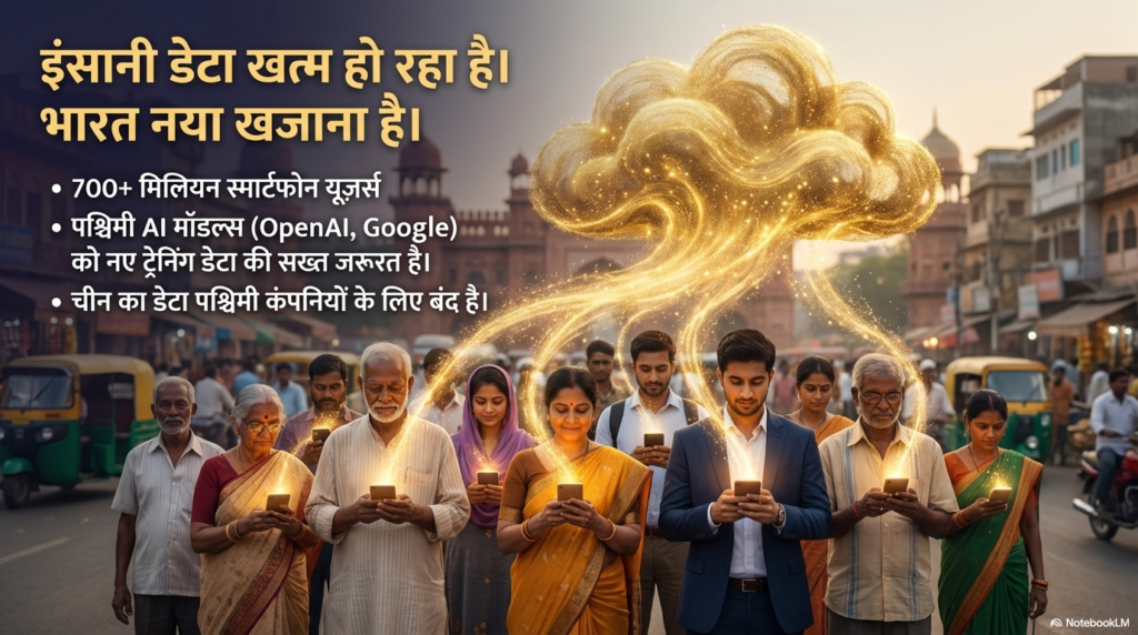 AI की दुनिया में एक बहुत मशहूर कहावत है—”डेटा ही नया तेल है।” और अगर ऐसा है, तो समझ लीजिए कि भारत इस दुनिया का सबसे बड़ा ‘सऊदी अरब’ है। हमारे 1.4 बिलियन (140 करोड़) लोग हर सेकंड जो डिजिटल निशान छोड़ रहे हैं, वो AI मॉडल्स के लिए वो ‘ईंधन’ है जो दुनिया में कहीं और मिलना नामुमकिन है।