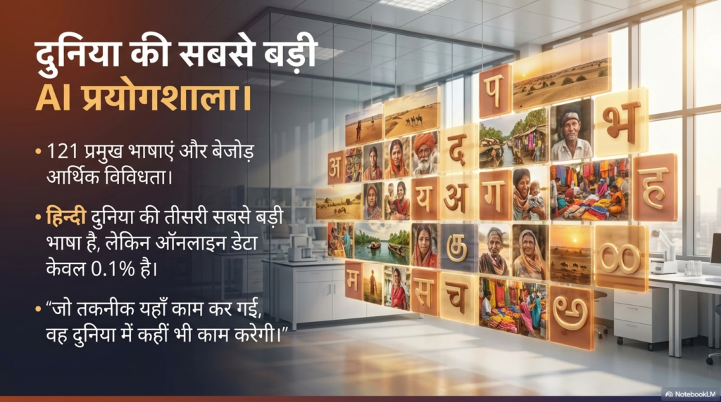 0.1% का जादुई आंकड़ा (The Data Paradox): यहाँ एक बहुत मजेदार और ‘उलटी’ बात है। हिंदी दुनिया की सबसे ज्यादा बोली जाने वाली भाषाओं में से एक है, लेकिन इंटरनेट पर मौजूद कुल टेक्स्ट का केवल 0.1% हिस्सा ही हिंदी में है। आपको लगेगा कि यह तो बुरी बात है? नहीं दोस्तों! टेक कंपनियों के लिए यह सबसे बड़ी चुनौती और मौका है। अगर कोई AI मॉडल भारत की उबड़-खाबड़ भाषाई विविधता (जहां हर 50 कोस पर बोली बदल जाती है) को समझ गया, तो वो दुनिया की किसी भी भाषा को आसानी से हैंडल कर लेगा। भारत एक ‘स्ट्रेस टेस्ट’ लैब की तरह है—जो यहाँ चल गया, वो पूरी दुनिया में राज करेगा!