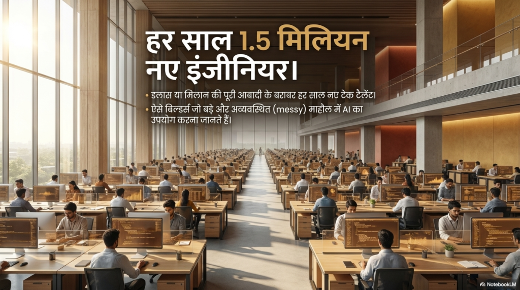 दोस्तो, मशीनें कितनी भी स्मार्ट हो जाएं, उन्हें बनाने और चलाने के लिए तो इंसान ही चाहिए न? और इंसानी दिमाग के मामले में हमारा कोई मुकाबला नहीं है। भारत हर साल लगभग 1.5 मिलियन (15 लाख) इंजीनियरिंग ग्रेजुएट्स पैदा करता है। यह संख्या कितनी बड़ी है? जरा सोचिए, यह इटली के मिलान या अमेरिका के डलास जैसे पूरे के पूरे शहर की आबादी के बराबर है!
