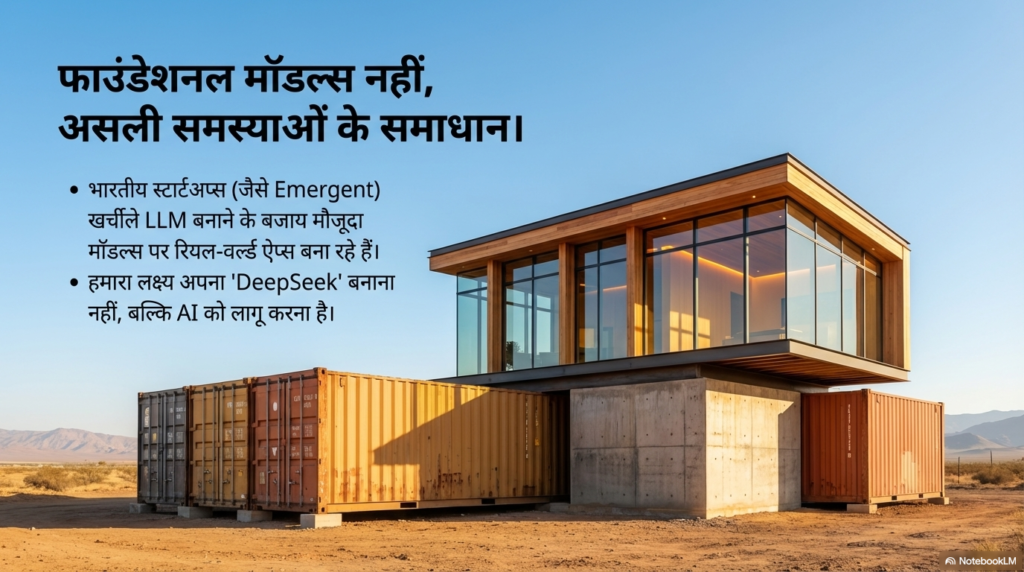 इसे ऐसे समझिए: अमेरिका अरबों डॉलर खर्च करके ऐसे मॉडल बना रहा है जो कविताएं लिखें या पेंटिंग बनाएं। लेकिन भारतीय स्टार्टअप्स, जैसे कि Emergent, ऐसे AI टूल्स बना रहे हैं जो असल समस्याओ को हल करें। Emergent एक ऐसा प्लेटफॉर्म है जहाँ आप सिर्फ बोलकर या टाइप करके अपना मोबाइल ऐप बना सकते हैं। हम नकल नहीं कर रहे, हम AI को आम आदमी के काम का बना रहे हैं।