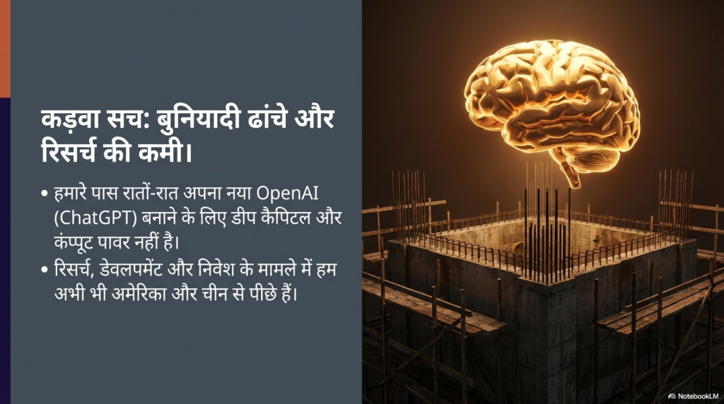 - डीप कैपिटल (बड़ा पैसा) की कमी: ChatGPT जैसा मॉडल बनाने के लिए अरबों डॉलर चाहिए और सालों तक घाटा सहने की हिम्मत चाहिए। भारत में अभी इतना ‘रिस्क’ लेने वाला पैसा कम है।