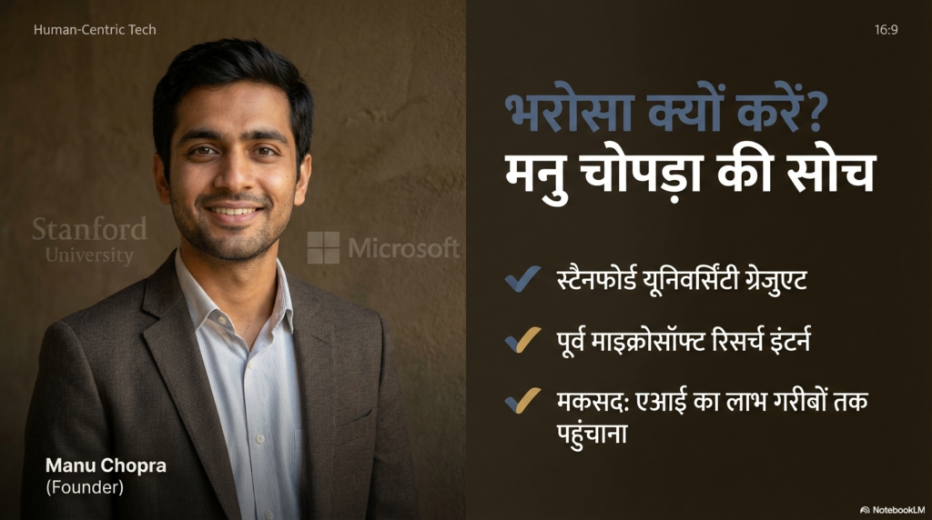 इस पूरे डिजिटल क्रांति के सूत्रधार मनु चोपड़ा की कहानी भी उतनी ही प्रेरणादायक है। 2015 में जब मनु ने स्टैनफोर्ड यूनिवर्सिटी में एक इंस्ट्रक्टर के तौर पर अपना करियर शुरू किया था, तभी से उनके मन में एक टीस थी। उनका ध्यान हमेशा ‘सोशल इम्पैक्ट प्रोजेक्ट्स’ पर रहता था, यानी ऐसी योजनाएं जिनसे समाज के सबसे निचले पायदान पर खड़े व्यक्ति का भला हो सके।