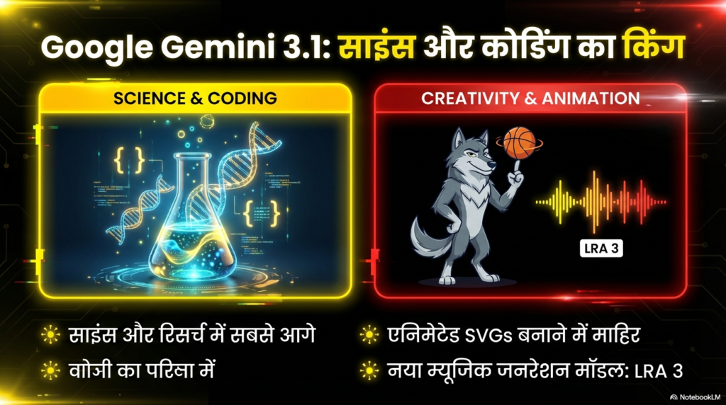 | Gemini 3.1 Pro | एनीमेशन और म्यूजिक | क्रिएटिव काम, साइंस और रिसर्च | Arc AGI 2 (Abstract Reasoning) में टॉप |