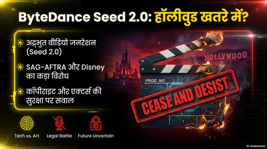 Q4: AI को लेकर हॉलीवुड में क्या विवाद चल रहा है? Ans: नए AI वीडियो मॉडल्स हूबहू असली एक्टर्स जैसे वीडियो बना रहे हैं। हॉलीवुड को डर है कि इससे एक्टर्स की पहचान और उनके काम का बिना अनुमति इस्तेमाल हो रहा है, जिसे वे “डिजिटल लूटपाट” कह रहे हैं।