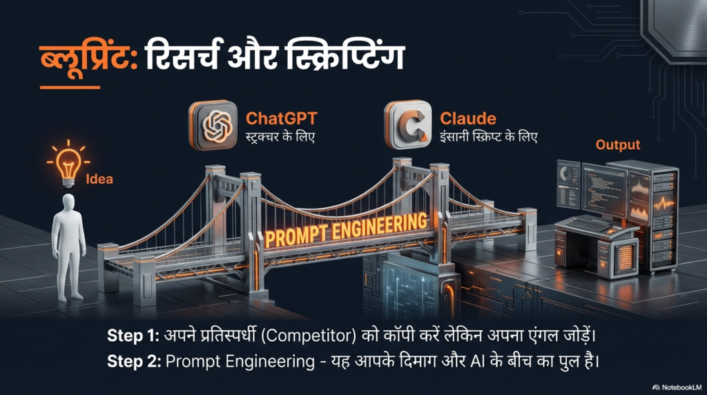 प्रो टिप: लंबी स्क्रिप्ट (15-25 मिनट की डॉक्यूमेंट्री) के लिए Claude AI का इस्तेमाल करें। लिख के ले लो, ChatGPT अक्सर 1400 शब्दों के बाद रुक जाता है या कहानी खराब कर देता है, लेकिन Claude लंबी और गहरी स्क्रिप्ट लिखने में उस्ताद है। स्क्रिप्ट के शुरू के 30 सेकंड में हमेशा ‘Cream Part’ (सबसे रोमांचक हिस्सा) दिखाएं ताकि लोग हुक हो जाएं।