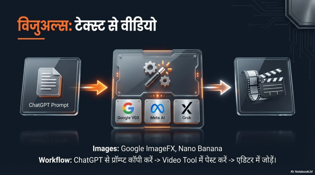 वर्कफ्लो: स्क्रिप्ट तैयार करें -> ChatGPT से विजुअल प्रॉम्प्ट्स लें -> Image FX से इमेज बनाएं -> VO3 में सब जोड़कर फाइनल वीडियो निकालें।