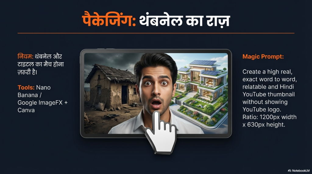 थंबनेल ऐसा होना चाहिए कि अंगूठा रुक जाए और क्लिक हो जाए। Canva और Nano Banana का यूज़ करें।